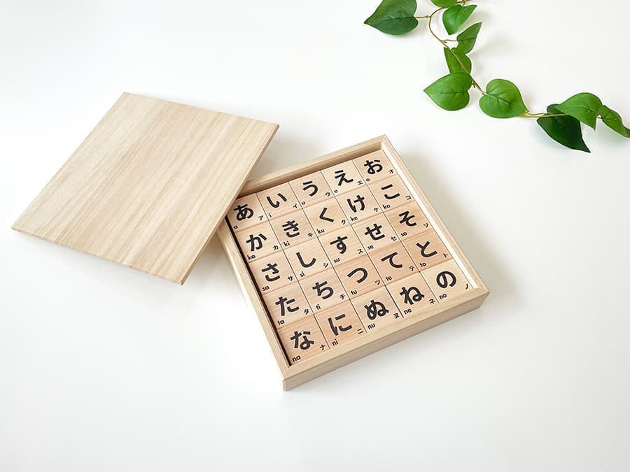 「あ」〜「ん」の46ピースに加え、無地の4ピース、合わせて50ピースのもじ遊び積み木です。