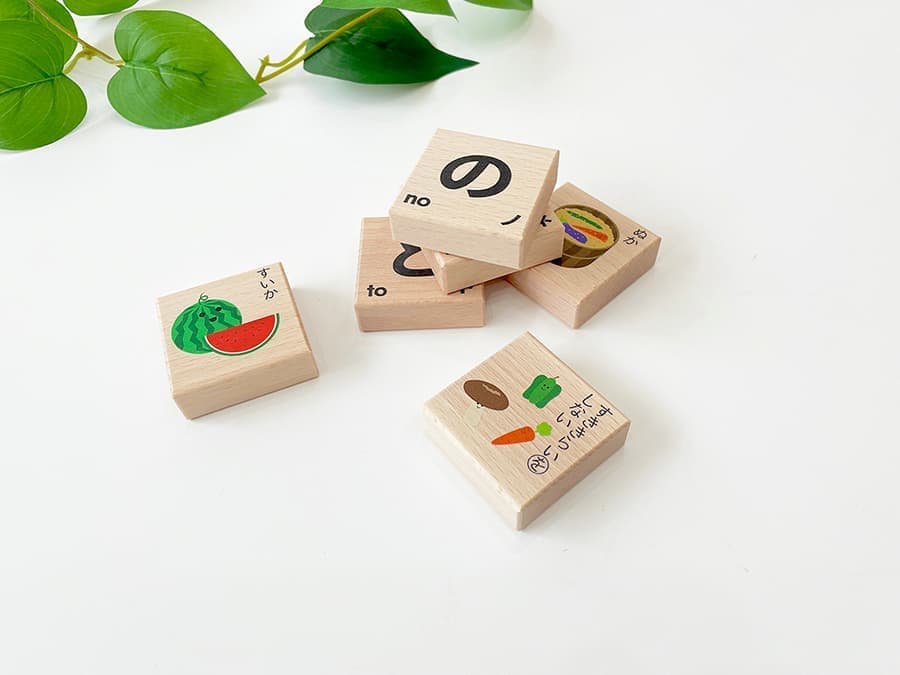 「あ」〜「ん」の46ピースに加え、無地の4ピース、合わせて50ピースのもじ遊び積み木です。